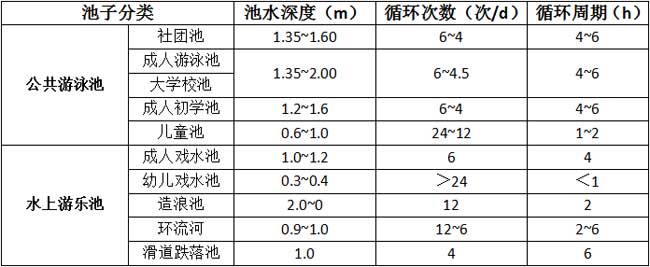 游泳池由于用途不同而循環周期也會不相同;水上游樂池也是因為其用途的不同循環周期也不同。除了用途,也包括泳池的水深、泳池負荷等因素確定循環周期;蛉缦卤恚
