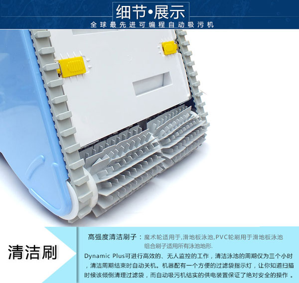 海豚2002全自動泳池吸污機采用帶過濾功能的吸污過濾袋,自動程式化工作,適用不同大小的泳池使用。休積細小,輕巧及操作容易。帶推車,便于使用及收藏。獨立設備,無需安裝。